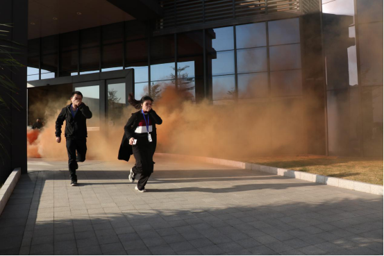 隨著煙霧彈的燃起,應急預案啟動,逃生演練正式開始。